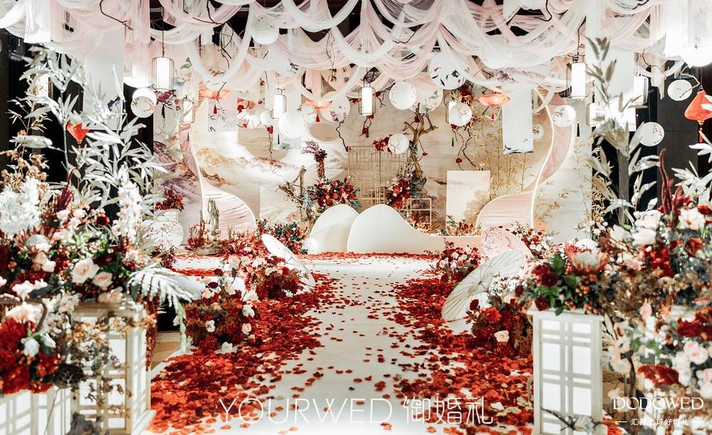 红色羽翼 环形仪式观礼区设计 以及利用酒店楼梯 作为新人入场通道 具有仪式感的一场婚礼设计 流程和场景融入其中