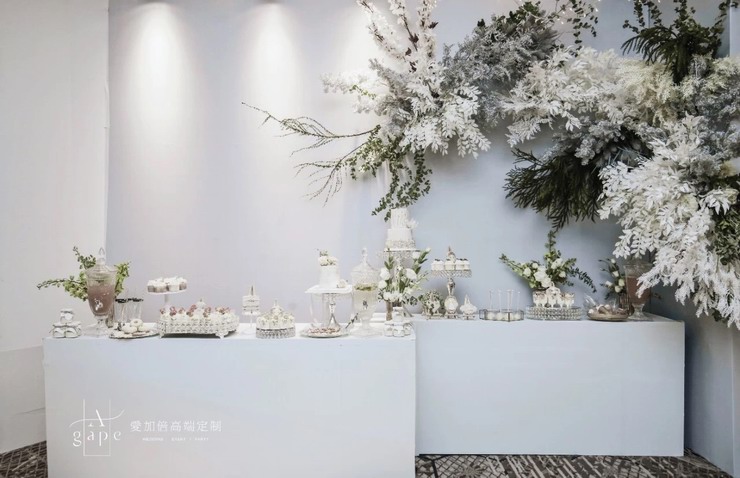 与主题呼应的甜品设计,不同于常规甜品设计,将主题与甜品融合,为整场画面锦上添花。白绿色系的甜品,将细节做到极致,让画面更加完美精致。