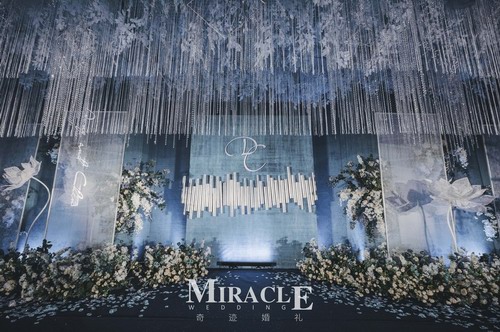 其次现场最不可缺少的就是灯光的使用,大量的自发光的星星灯,暗夜效果的拍摄,对于光效和照明度要求颇高,太亮不够梦幻、太黑不利运转,设计师因此在主舞台的周围加上了即为装饰设计的荧光灯管同时侧面加强灯光效应。于是光效的色彩对比、灯光的层次分化,让婚礼设计的还原更加立体。