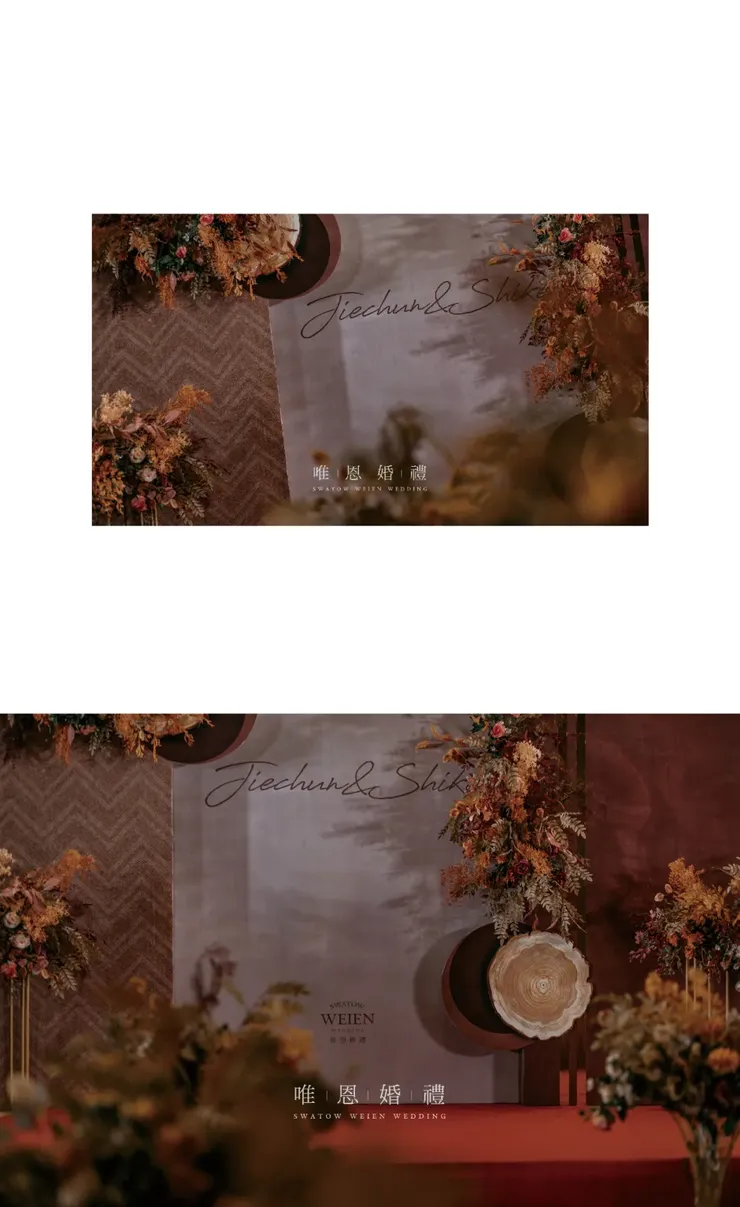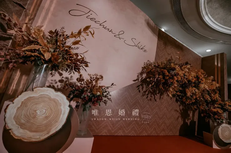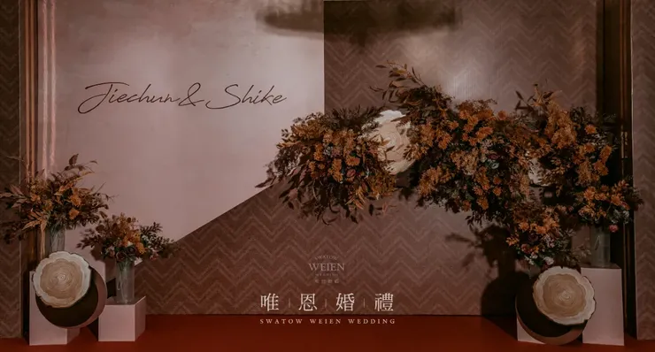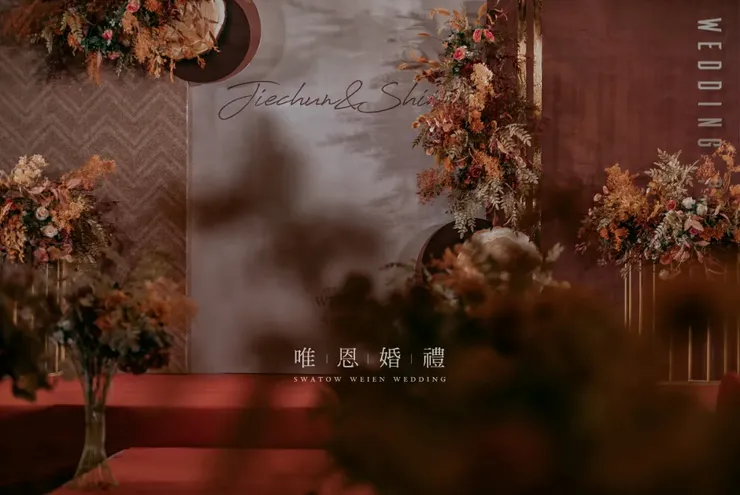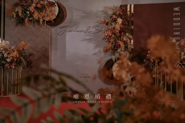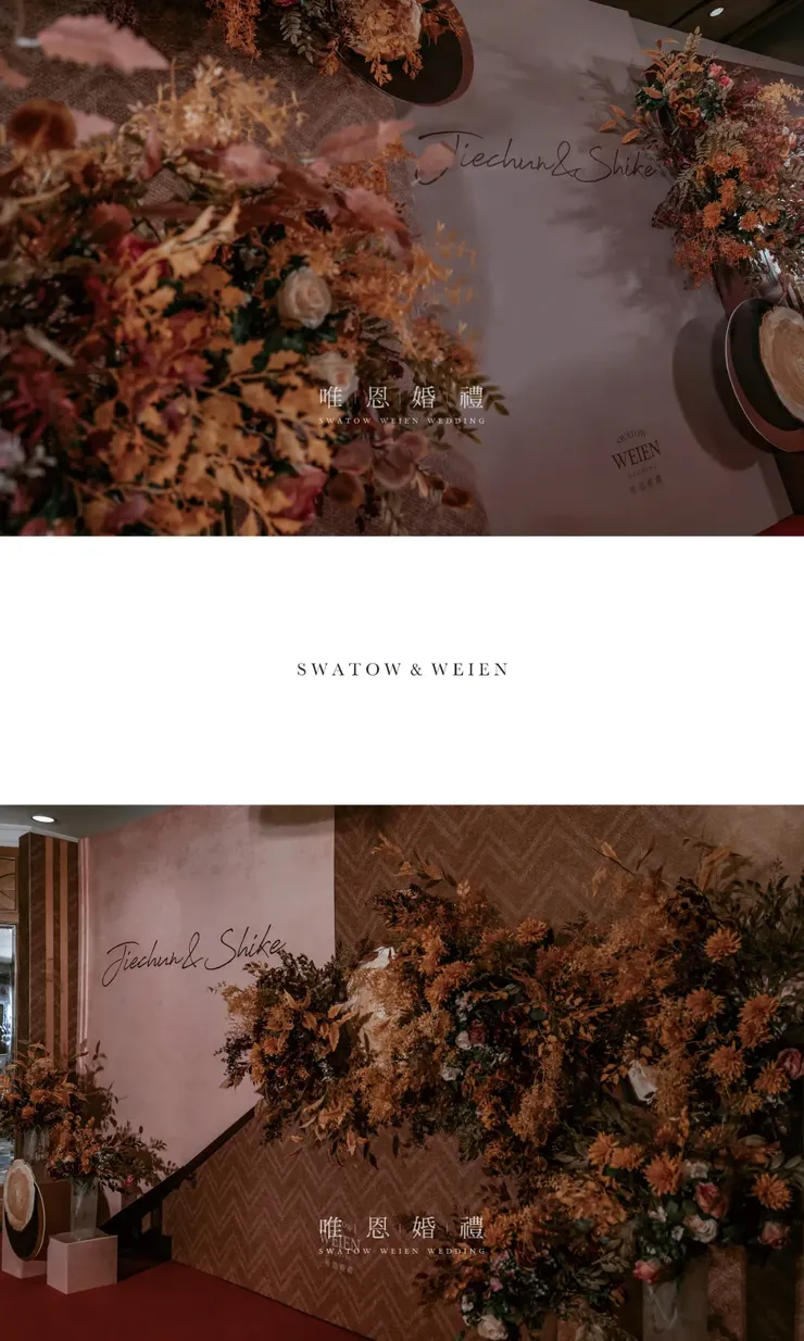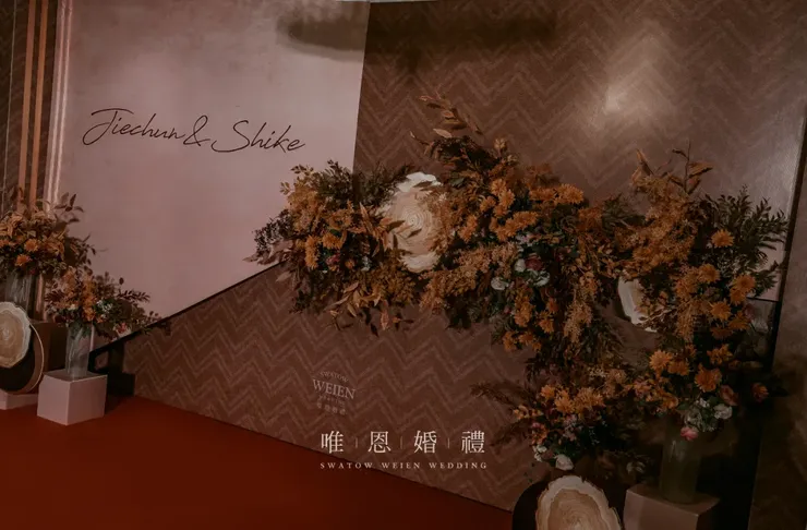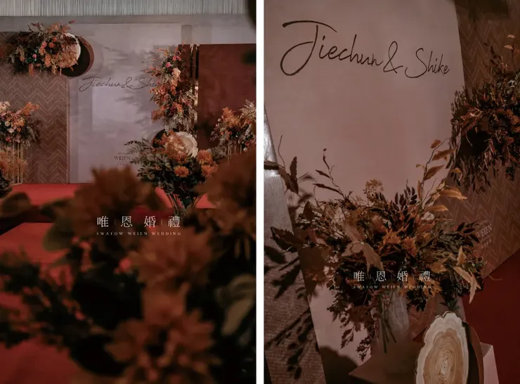 以橘色與咖色為主色的花藝點綴其中,