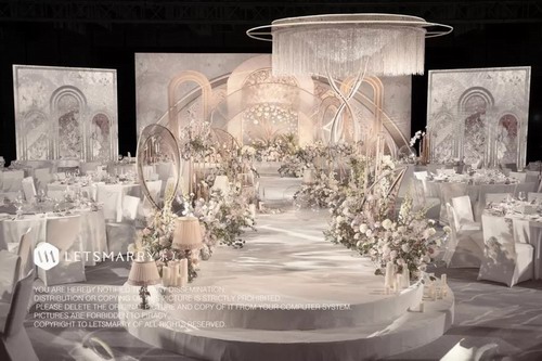 金色线条是辅助配色,细节处作为点缀,让整个宴会厅增添华丽贵气,暗红色也透露着浪漫迷人气息。
