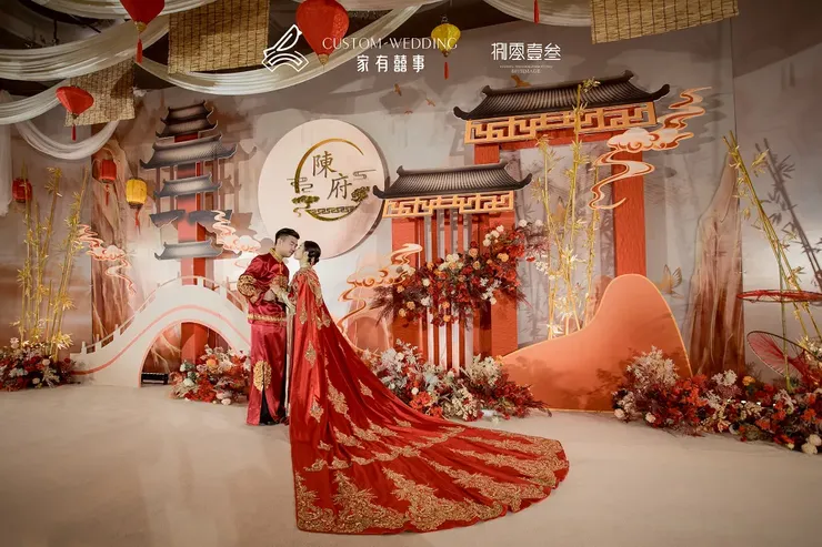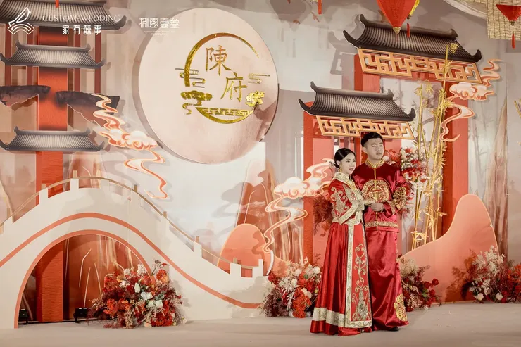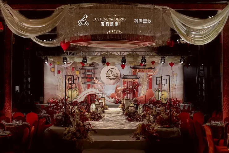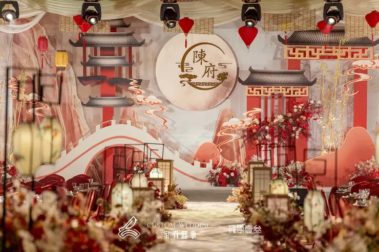 在T台两侧挂上不同形状的灯笼,象征恩爱团圆,幸福红火,