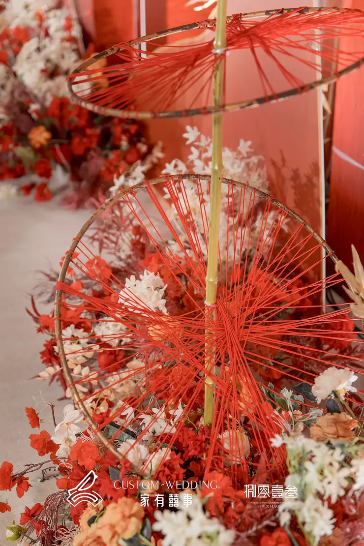 亭台吊顶采用了大面积的绸缎作为装饰,营造中式婚礼氛围感,