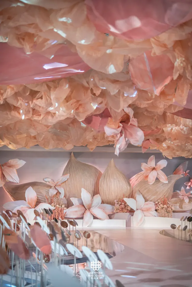 从迎宾区过道开始,纵身跃入花的世界,虾粉色系花艺引人入胜,