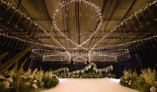 这场婚礼主背景的设计像是王座和皇冠的结合,立体感很强的发散形结构,让原本平白的空间有了视觉秩序,视觉重点从中心的位置向周围发散,纯白的色彩之下,不同材料的使用,增添了视觉趣味,比如立体的雕刻和镜面的细节,区别于常规的婚礼设计,让人看后有新的发现、新的感受。