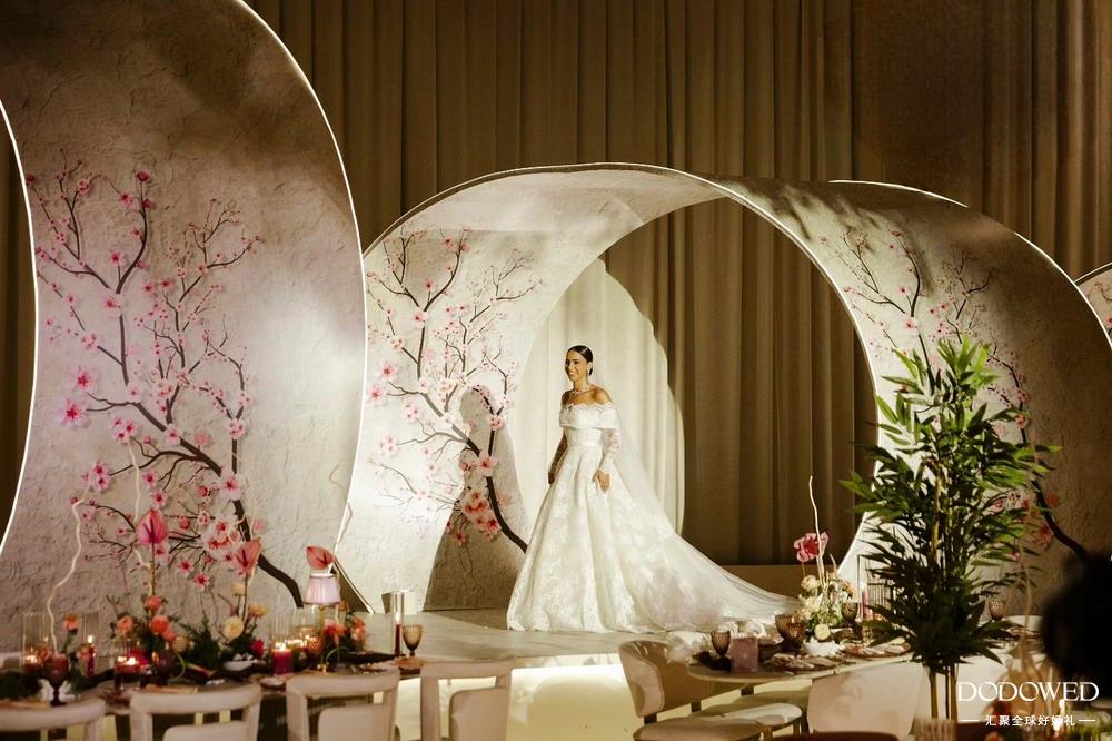这场婚礼是一场融合东方美学与现代奢华的沉浸式主题婚礼,以“樱韵”为核心设计理念,从仪式区到宴会区再到迎宾动线,构建出层次丰富的浪漫场景。