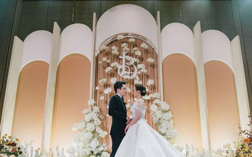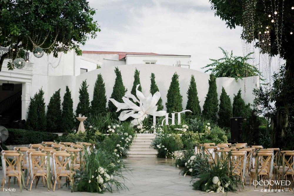 这场婚礼以白绿色为主调,将极简设计与自然野趣巧妙融合,打造出如同“都市绿洲中的纯净仪式”般的场景。主背景的巨型白色艺术花装置,似一朵在自然中绽放的梦幻之花,与后方整齐的绿色乔木形成强烈视觉对比,既具艺术感又充满自然气息;白色花艺与绿色植被的搭配,从仪式通道两侧延伸至主舞台,如自然生长的花境,让每一位步入仪式区的宾客都仿佛踏入了一片纯净的秘密花园。