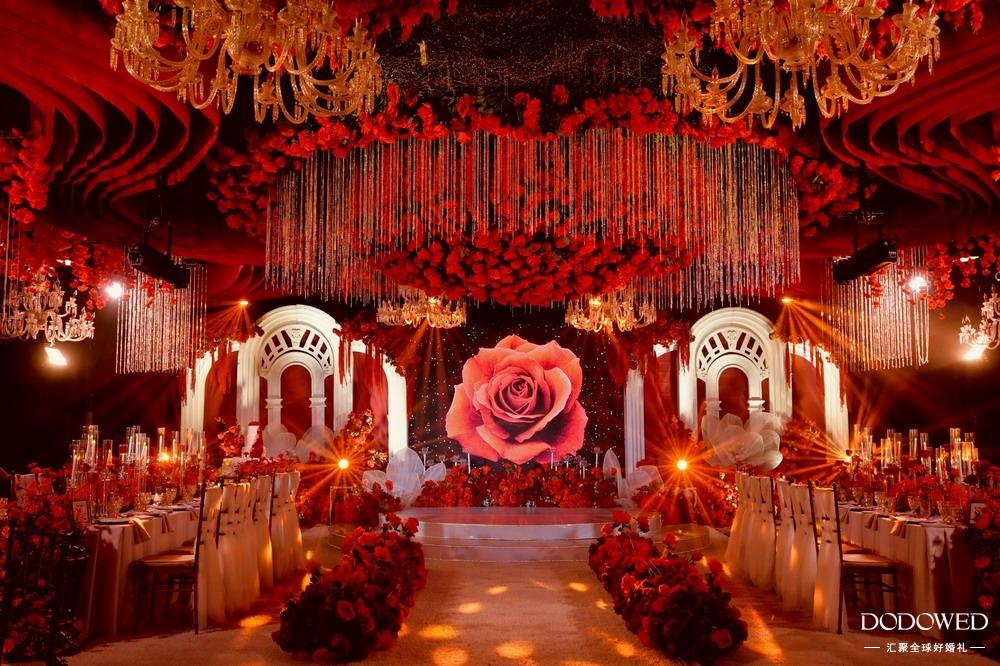这场婚礼将浓烈的浪漫与奢华质感融合,用极致的红色花艺与水晶光影,打造出一场沉浸式的玫瑰梦境婚礼。