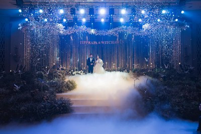 整场婚礼摒弃繁杂色彩,以极致纯白为基底,融合镜面、纱幔与花艺,构建出一个空灵、通透的梦幻空间。设计核心在于利用镜面反射与流线型布幔,打破空间边界,营造出无限延伸的视觉效果,象征着爱意的绵延不绝。