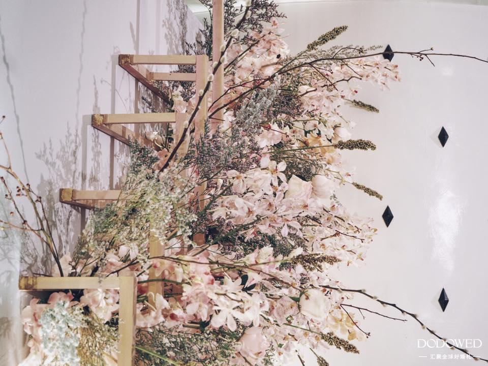 中式元素与温暖柔和的彩色花朵碰撞, 让我们领略到一个与众不同的现代中国风,婚礼中最特别的是浅金色木质板材构造出的迎宾通道,空中垂吊的花朵也很讨喜,温温和和的,蛮有气质。