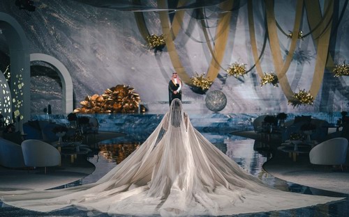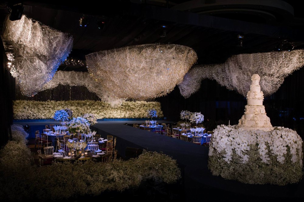 新娘想要一个童话婚礼,而新郎是严格的极简主义者,为了能结合双方的意愿,设计师运用哥特式多层玻璃窗以及拱门,以浪漫的艺术风格,优雅的解决了新人的意见分歧。我们可以看到高贵的金丝绒台布、餐巾和绿松石色的图案形成该设计的基础,还采用了偏白色或透明色的桌椅,简单明了,使设计更具现代感。